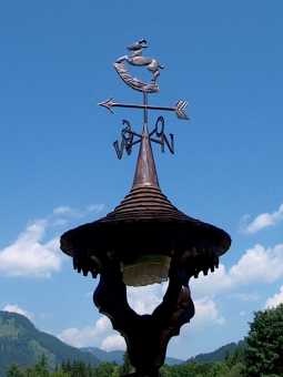 Plastisch getrieben aus mehreren Teilen zusammengefalztmit Pfeil leicht drehend auf Stiefel mit den vier Himmelsrichtungen.Gesamthöhe ca 90 cm