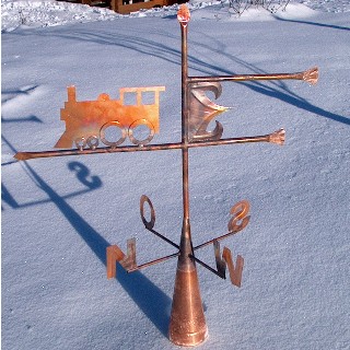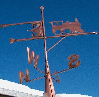 Wetterfahne aus Kupfer mit Himmelsrichtungen und einer Dampflokomotive, leicht drehend gelagert montiert.