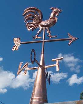 Wetterhahn in Kupfer Natur mit Himmelsrichtungen. Hahn mit Pfeil drehend auf Kupferstiefel höhe ca 90 cm